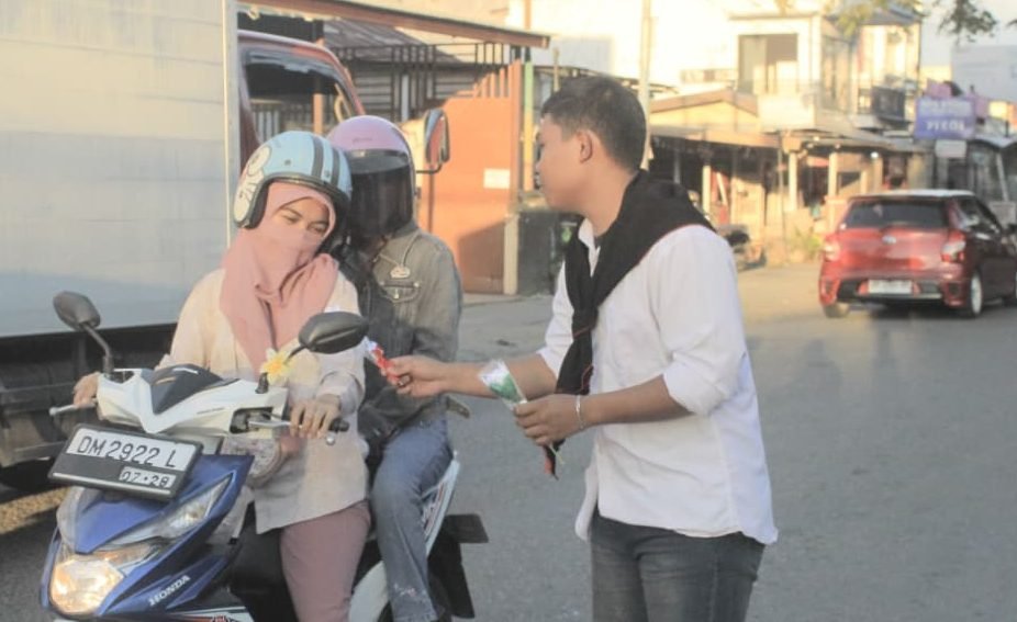 Dalam kegiatan itu, para peserta membagikan bunga mawar putih kepada pengguna jalan sebagai simbol perdamaian dan penghormatan terhadap para pahlawan bangsa.