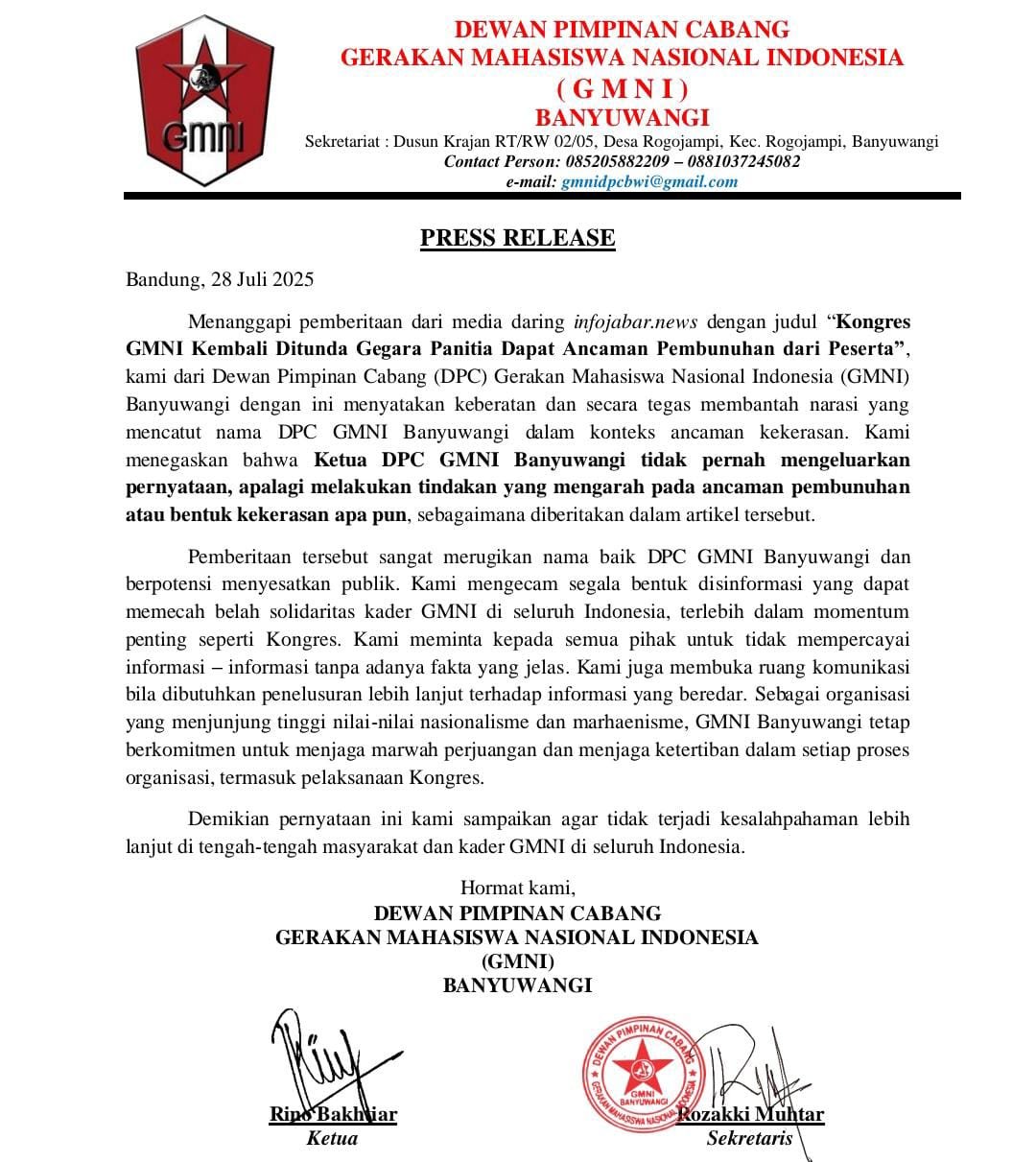 “Kami dari Dewan Pimpinan Cabang (DPC) Gerakan Mahasiswa Nasional Indonesia (GMNI) Banyuwangi dengan ini menyatakan keberatan dan secara tegas membantah narasi yang mencatut nama DPC GMNI Banyuwangi dalam konteks ancaman kekerasan,” tegas Ketua DPC Rino Bakhtiar dalam pernyataan tertulis, Senin (28/7).