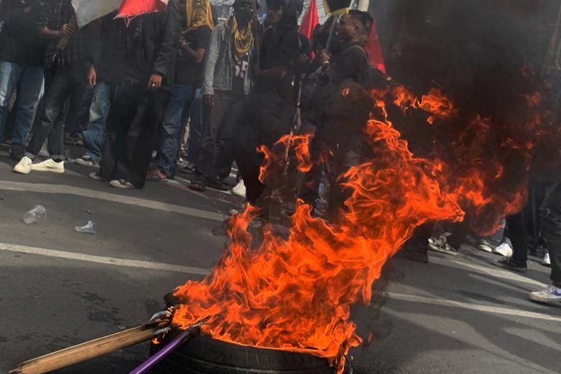 Situasi memanas ketika sejumlah demonstran membakar ban bekas di tengah jalan. Asap hitam pekat menyelimuti udara, diiringi sorakan riuh massa aksi.