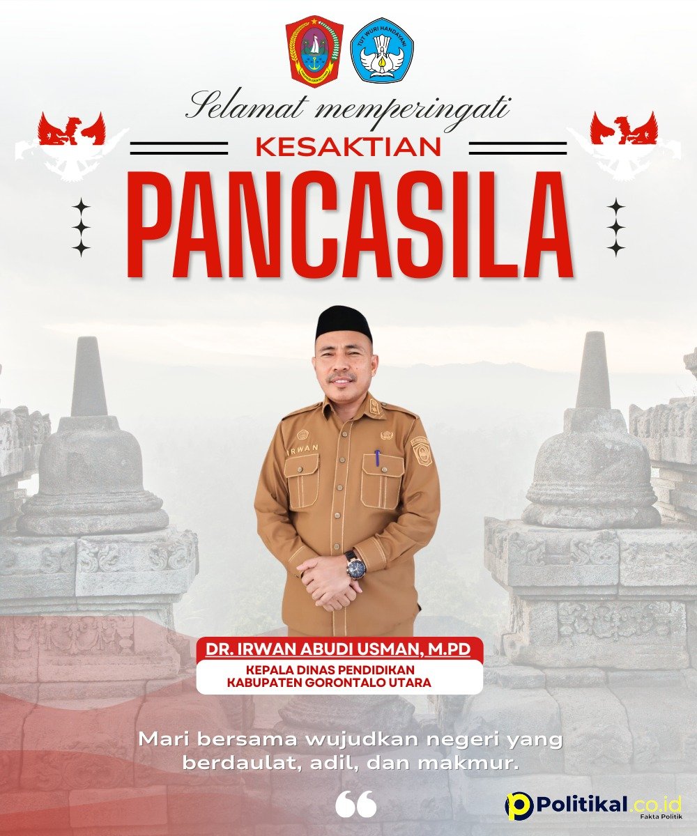 Politikal – Kepala Dinas Pendidikan Kabupaten Gorontalo Utara, Dr. Irwan Abudi Usman, M.Pd., menyerukan pentingnya peneguhan nilai-nilai Pancasila di lingkungan pendidikan pada momentum Hari Kesaktian Pancasila, Selasa (1/10).
