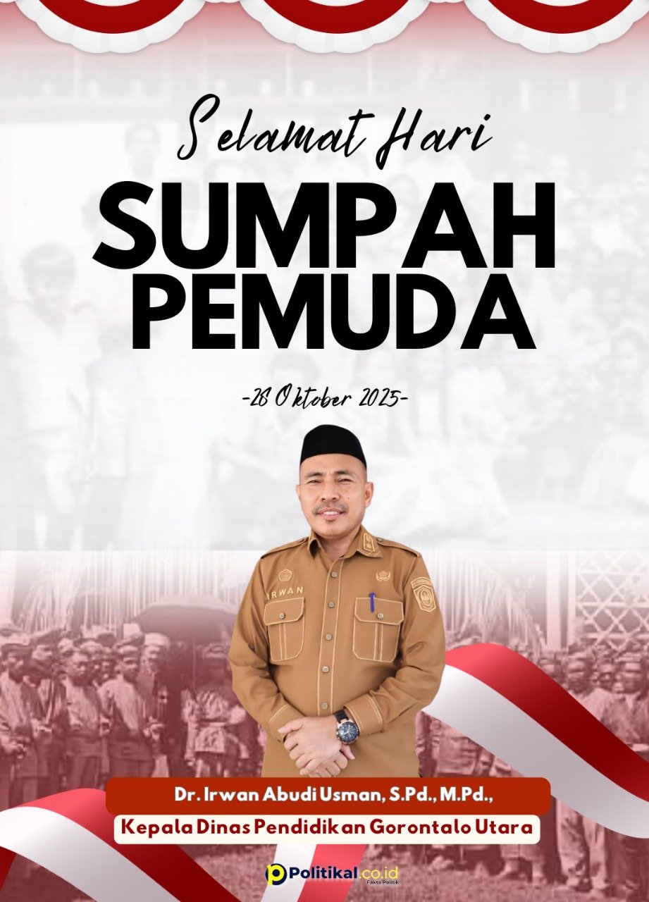 Politikal – Kepala Dinas Pendidikan Kabupaten Gorontalo Utara, Dr. Irwan Abudi Usman, M.Pd, mengajak generasi muda untuk memaknai momentum Hari Sumpah Pemuda ke-97 tahun 2025 sebagai refleksi atas pentingnya semangat persatuan, kolaborasi, dan kontribusi nyata dalam pembangunan daerah.